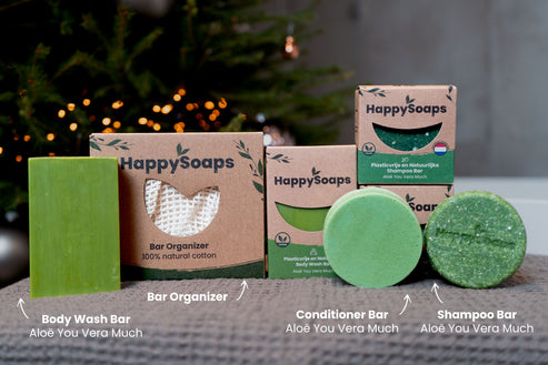 Skäm bort dig själv eller någon annan med vårt gåvoset med HappySoaps populäraste produkter! Detta kit innehåller en Shampoo, Conditioner och Body Wash Bar med den älskade aloe vera-doften, för kroppsvård från topp till tå, plus en praktisk Bar Organizer så att du snyggt och enkelt kan förvara dina produkter och ha dem nära till hands. Självklart 100 % plastfritt!